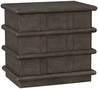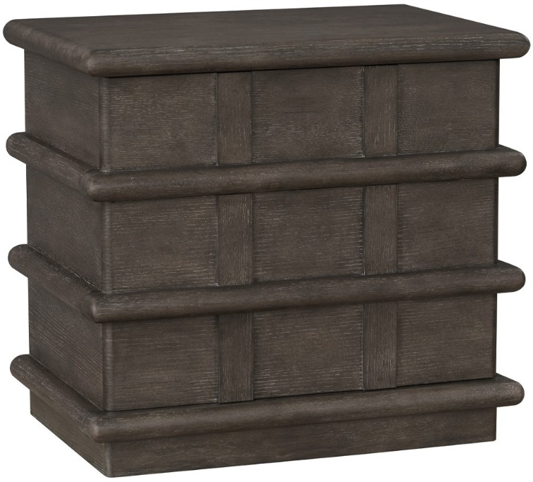 Crafted with select hardwood solids and veneers in a mocha finish, this nightstand features a handsome top, two drawers, a push to open mechanism for the drawers, grid panel design with horizontal molding accents, and a plinth base.Read More