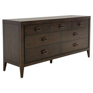 Crafted of mango solids in a dark brown finish, this dresser features a handsome top, seven drawers, bronze finished metal hardware, and tapered feet.Read More