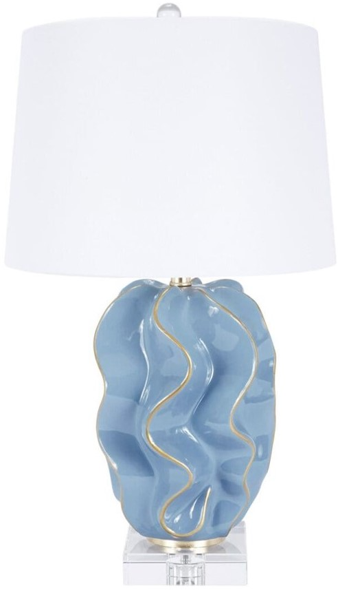 With a crystal foot and finial, this table lamp features a sculptured wave cerulean-blue ceramic base accented with gold leaf details, complemented by a clean white shade that softly diffuses light, adding artistic elegance and a refined pop of color to any space.Read More
