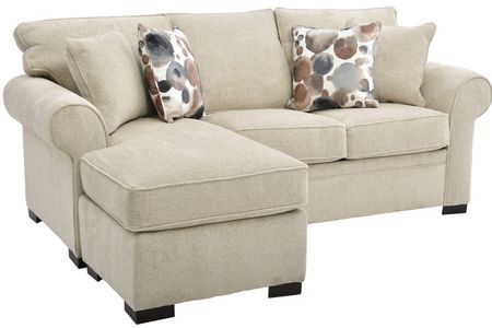 Upholstered in a sand-colored velour fabric, this sleeper sofa features padded back cushions, reversible seat cushions, reversible chaise cushion, padded rolled arms, two matching toss pillows, two contrasting toss pillows, a pull-out queen-size memory foam mattress, tailored base, and black feet in a dark brown finish.Read More