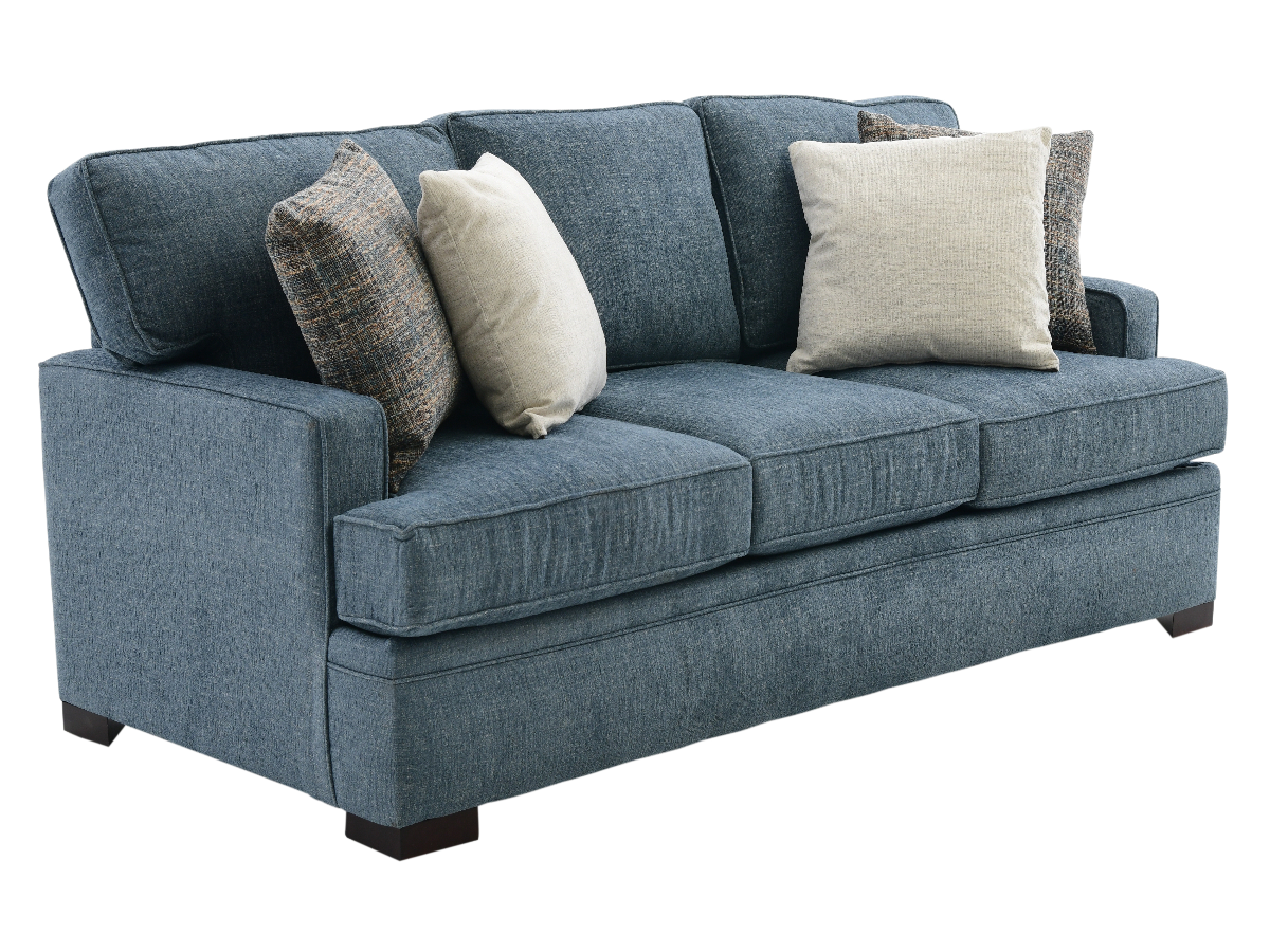 Upholstered in a denim blue woven fabric with off-white undertones, this sleeper sofa features reversible back and seat cushions, padded track arms, two coordinating toss pillows, two contrasting toss pillows, tailored base, and block feet in a dark brown finish.Read More