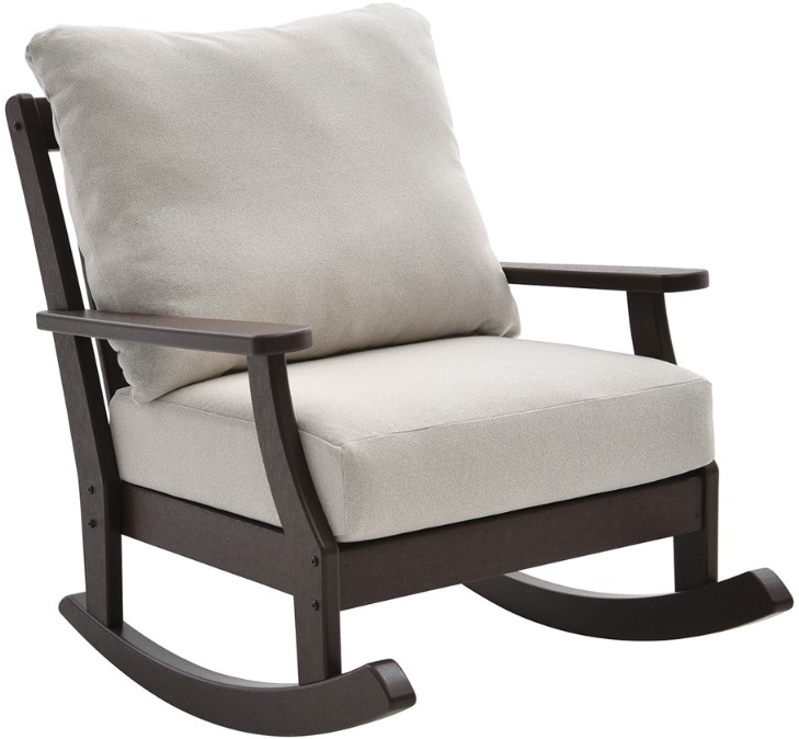 Crafted of genuine Polywood lumber in a dark brown finish, this chair features a plump back and seat cushion upholstered in a cream woven fabric with taupe undertones, track arms, and a rocker base.Read More
