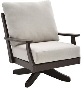 Crafted of genuine Polywood lumber in a dark brown finish, this chair features a plump back and seat cushion upholstered in a cream woven fabric with taupe undertones, track arms, and a 360-degree swivel base.Read More