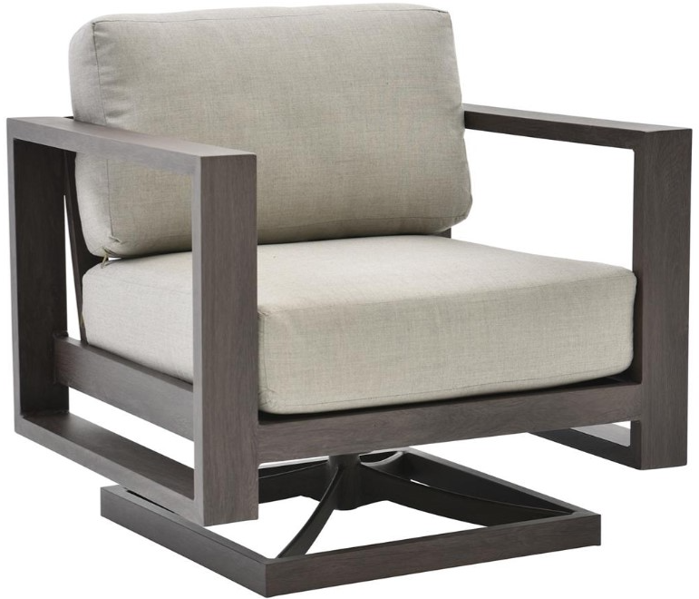 With a brown aluminum frame finished to look like natural wood, this swivel rocker features plump cushions covered in a stone-gray outdoor fabric, track arms, and a 360-degree swivel and rocking base.Read More