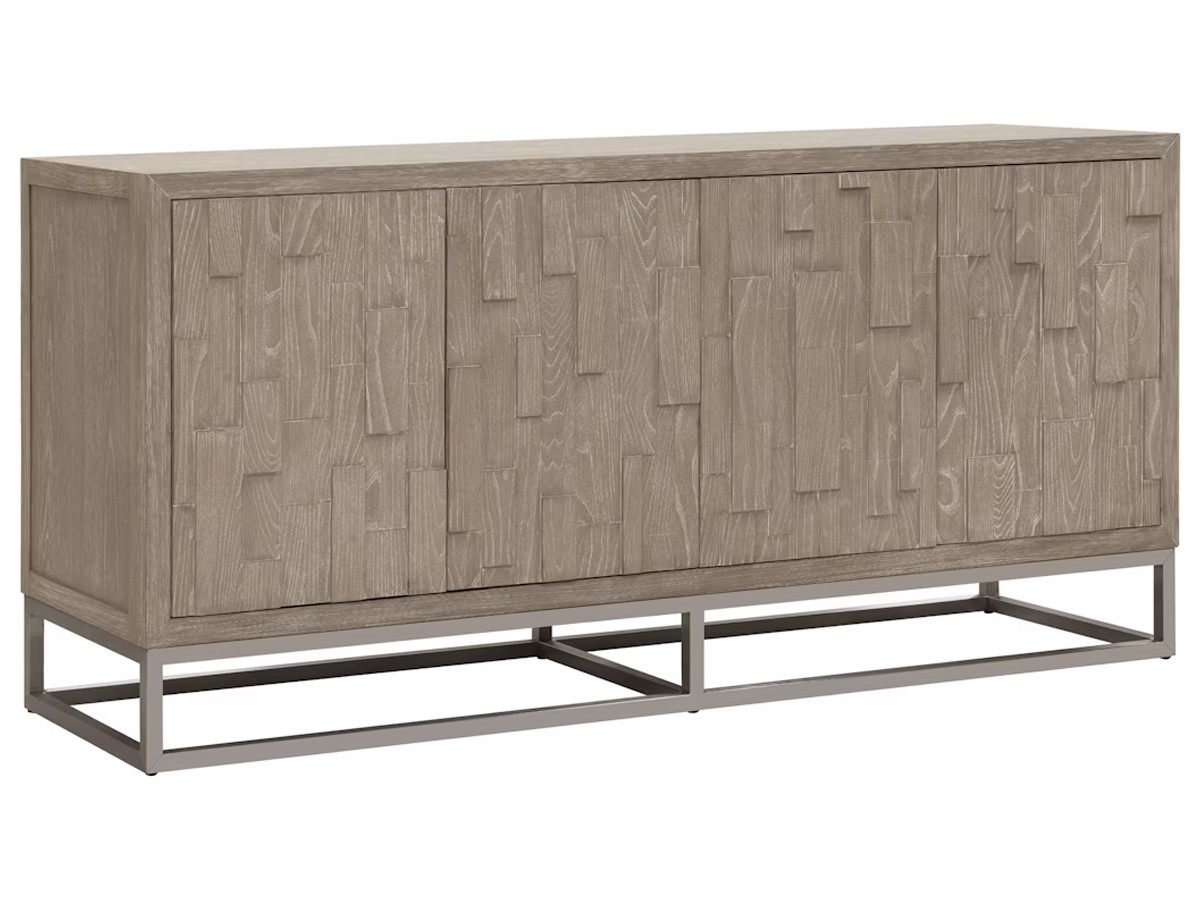 From the Drew & Jonathan Heritage Accents collection, this credenza is crafted with flat cut elm wood in a light tan finish. This credenza features four doors with a distinctive pattern design, two adjustable shelves, wire management, and a metal base in a nickel finish.Read More