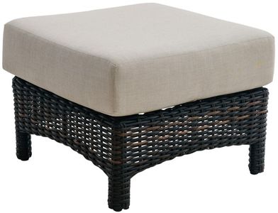 With an all-weather wicker frame in a hickory and dark brown finish, this ottoman features a plump cushion upholstered in a light khaki brown SPF-protected fabric with a taupe undertone, tailored base, and rounded block feet.Read More