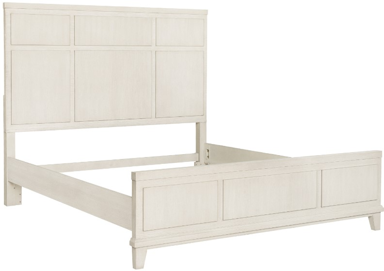 Clean, chic and casual with a serene natural white finish that highlights the character of the Quartered Ashe Wood Veneer construction, the Madison King Panel Bed is a stylish centerpiece for any bedroom space. The headboard and footboard of the bed feature a panel overlay design for added dimension and depth. Shaped splay feet elevate the bed.