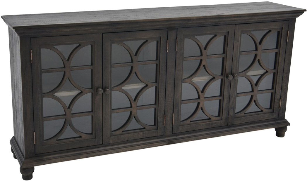 Crafted from Brazilian pine wood solids in a rich Kona brown finish, this console features four glass-inset doors with an eye-catching geometric design, a spacious interior shelf for storage, classic wooden knobs, and elegant onion feet that add a touch of traditional charm.Read More