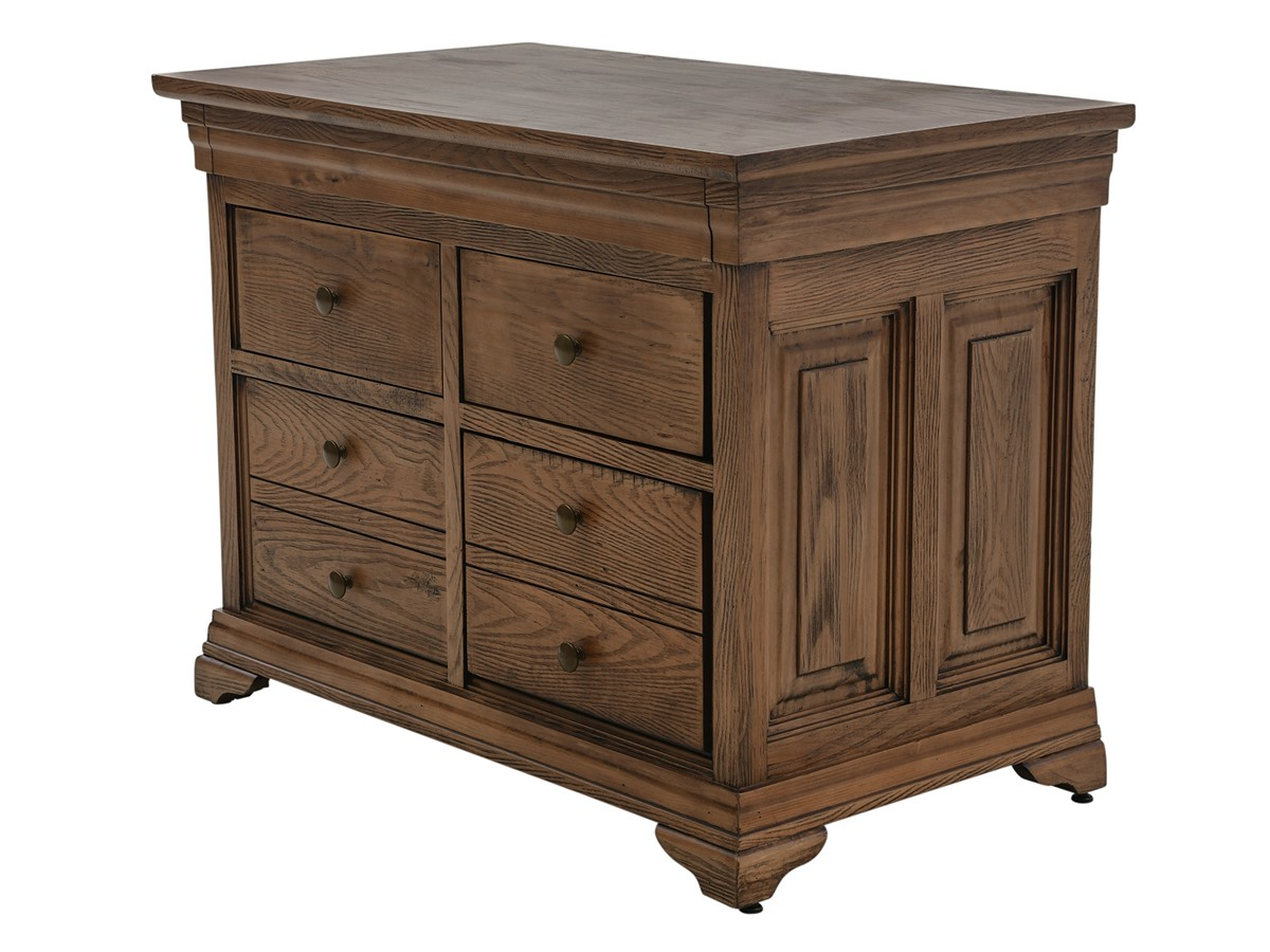 Crafted with select hardwood solids and veneers in a warm brown finish, this file cabinet features a drop-front felt-lined keyboard drawer, two drawers with removable dividers, two file cabinet drawers (hidden drawer within one file cabinet), dark brass finished metal knobs, and bracket feet.Read More