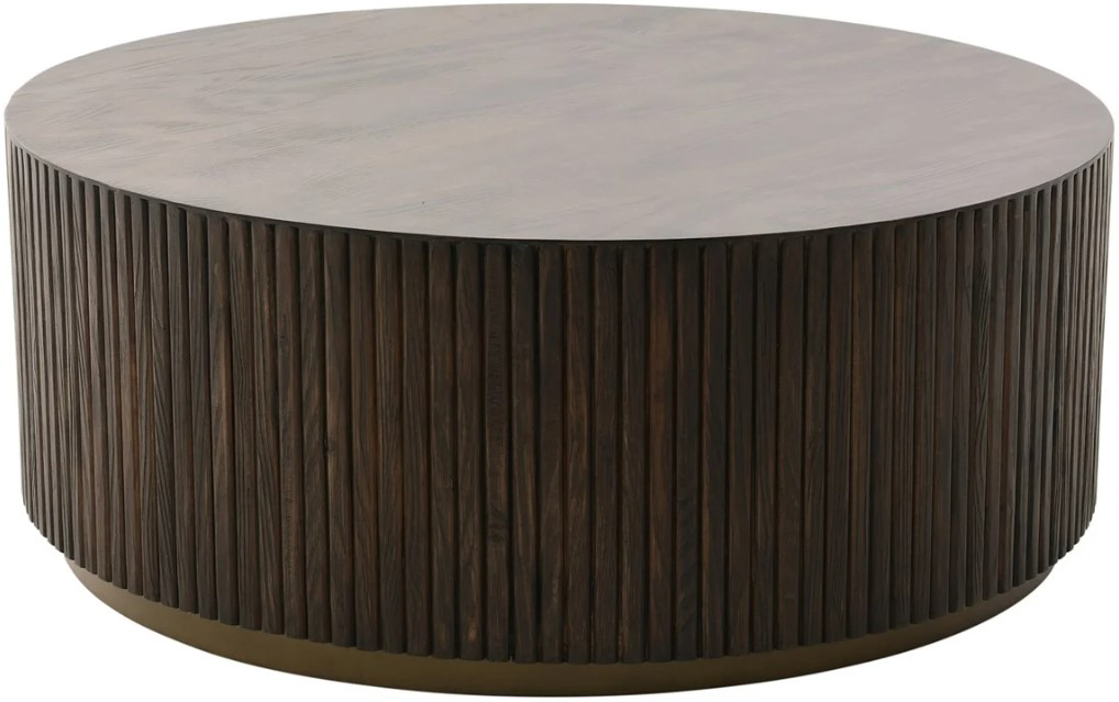 Crafted of Brazilian pine solids in a dark brown finish, this coffee table features a handsome top, reeded-style sides, brass finished metal plinth base, and casters for easy movement.Read More