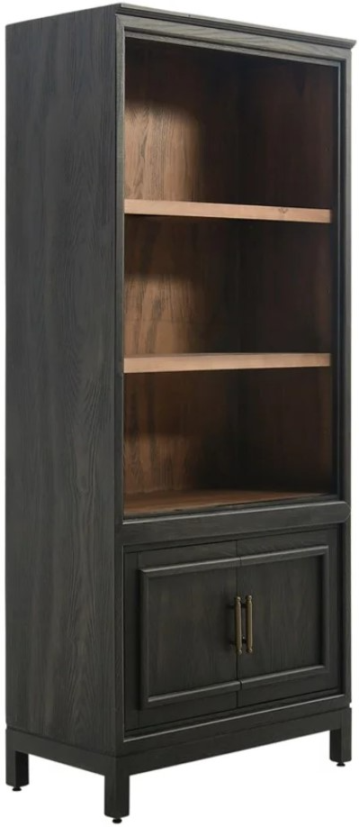 Crafted with select hardwood solids and veneers in a dark brown finish, this open bookcase features a warm brown finished interior, three adjustable shelves (one is behind the cabinet doors), brass finished metal door pulls, and block feet.Read More