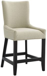 Upholstered in an oatmeal-colored woven fabric with taupe undertones, this counter stool features a padded slightly curved back, a plump seat cushion, and a wooden frame in a dark brown finish with a footrest and tapered legs.Read More