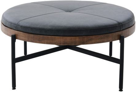 With a black metal finished base with stretchers, this coffee table features a button-tufted padded top upholstered in a black leather, stitched accents, and a wooden support in a warm brown finish.Read More