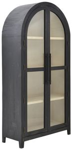 Crafted with Brazilian pine wood in a weathered black exterior finish and contrasting almond interior, this display cabinet features two glass-inset doors, an arched top, three shelves, metal door handles in a black finish, and tapered feet.Read More