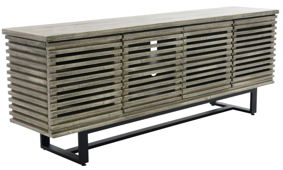 Crafted of Brazilian Pine solids in a distressed hazel wood finish, this entertainment console features a planked-style, four louvered doors, three interior shelves, wire management, and a metal base in a black finish.Read More