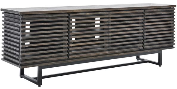 Crafted with solid Brazilian Pine wood in a mocha finish, this entertainment console features a planked-style top, four louvered doors with an interior shelf behind each area, and a metal base in a black finish.Read More