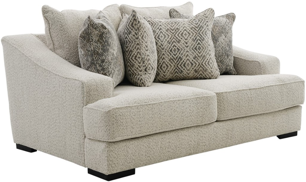 Upholstered in a cream woven fabric with taupe undertones, this loveseat features reversible back and seat cushions, padded arms, four coordinating toss pillows, tailored base, and block feet in an espresso finish.Read More