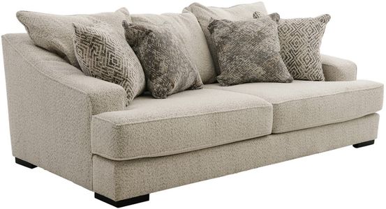 Upholstered in a cream woven fabric with taupe undertones, this sofa features reversible back and seat cushions, padded arms, four coordinating toss pillows, tailored base, and block feet in an espresso finish.Read More