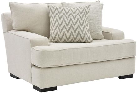 The Loxely chair is covered in a crème-colored performance fabric. This comfortable chair features reversible back and seat cushions, padded track arms, two contrasting down blend toss pillows, a tailored base, and black tapered feet.Read More
