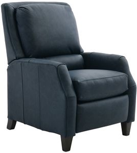 Upholstered in a navy-blue top-grain leather, this recliner features premium steel springs, plump bustle back, premium foam seat cushion, padded arms, welt accents, and tapered feet in a mocha finish.Read More