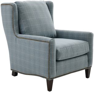 Upholstered in a plaid sky blue woven fabric, with off-white, dark blue, and teal undertones, this chair features premium steel springs, plump back cushion, reversible premium foam seat cushion, padded arms, antique gold finished nailhead trim, tailored base, and tapered feet in a dark brown finish.Read More