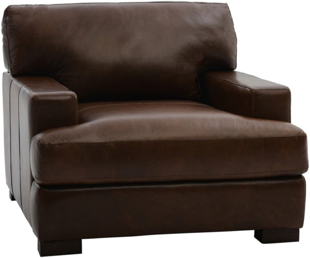 Upholstered in an Italian chocolate brown top-grain leather, this chair features a plump back and seat cushion, padded track arms, stitched accents, tailored base, and block feet in a dark brown finish.Read More