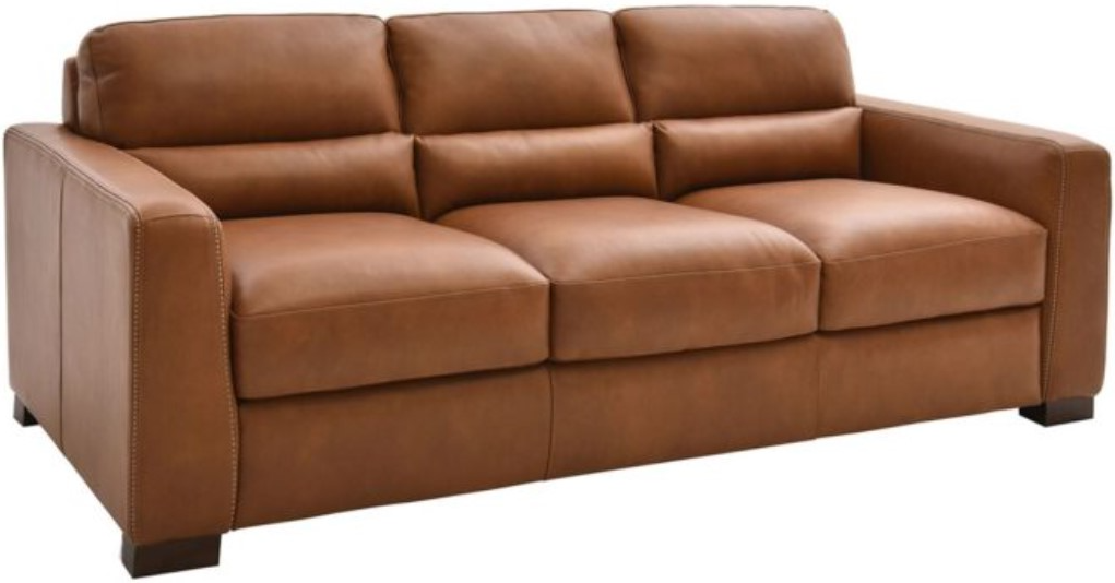 Upholstered in a cinnamon-brown top-grain Italian leather, this sofa features plump back and seat cushions, lumbar support, padded track arms, stitched accents, tailored base, and block feet in a dark brown finish.Read More