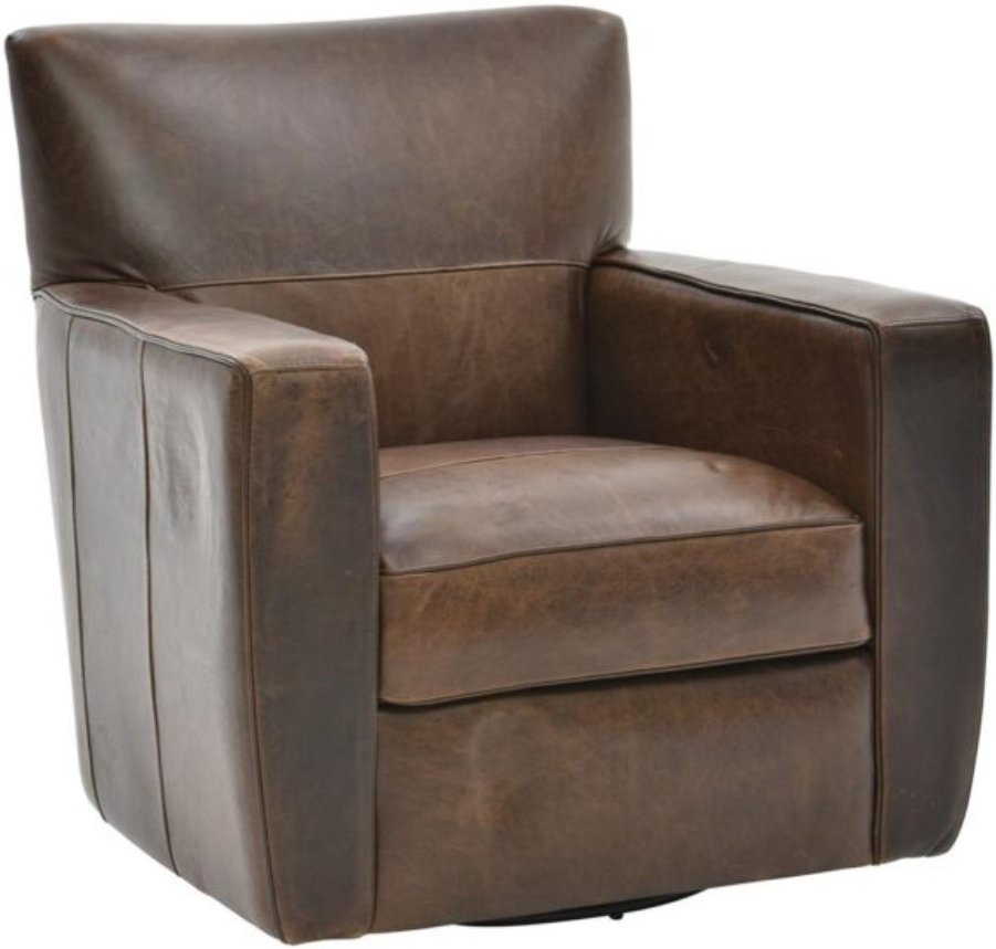 Upholstered in a dark chestnut quality top-grain Italian leather, this swivel chair features a padded fitted back, plump seat cushion, padded track arms, tailored base, with a 360-degree swivel base.Read More