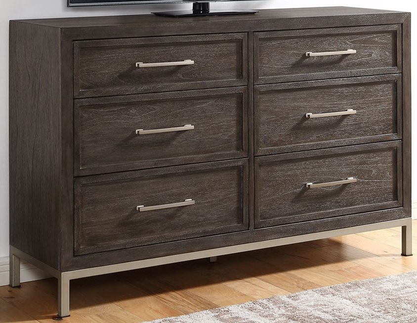 With a modern take on transitional styling, Broomfield is a study in simplicity with clean lines and an elegant mix of materials. This bedroom is sleek, yet warm and inviting with a warm walnut color finish that beautifully complements the champagne finished metal on bases and hardware. Picture frame drawer fronts add just the right amount of trim to accent the collection perfectly.