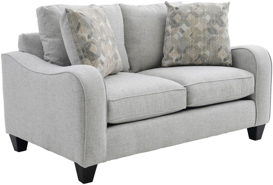 Upholstered in a gray woven fabric with black and dark gray undertones, this loveseat features reversible back and seat cushions, padded track arms, two coordinating toss pillows, tailored base, and tapered block feet in an espresso finish.Read More
