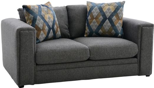 Upholstered in a dark blue woven fabric with light blue, brown, tan, and cream undertones, this loveseat features reversible back and seat cushions, padded track arms, two coordinating toss pillows, and a tailored base.Read More