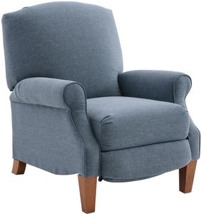 Upholstered in a denim blue woven fabric with cream and dark blue undertones, this recliner features a padded tight back, a plump seat cushion, padded rolled arms, and tapered block feet in a warm brown finish.Read More