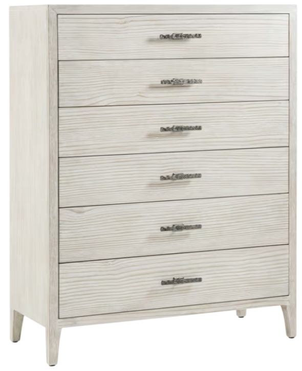 A modern take on a classic silhouette, the Breeze Tall Chest seen in here our Sea Salt finish is accented with ribbed cast bar hardware in Dark Sterling finish and six soft closing drawers. Standing elegantly on tapered feet.Read More