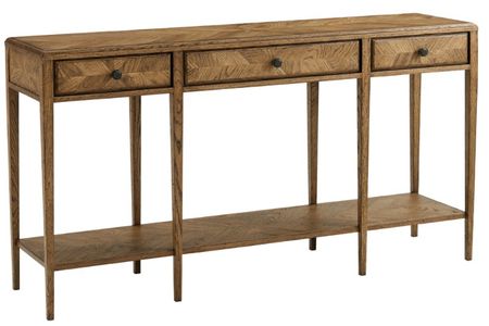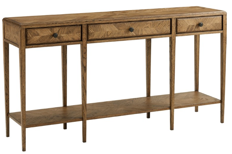 Displaying NOVA’s instantly recognizable mirrored herringbone oak parquetry on its top and drawer faces, this two tiered console table with three frieze drawers shines in our Dawn finish. Completed with three Verde Bronze finished handles and solid tapered oak legs.Read More
