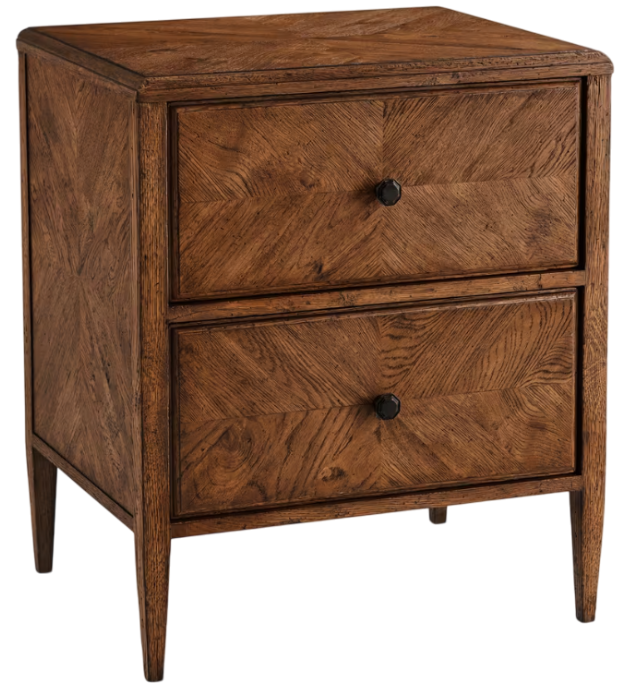 A new bright star in the world of nightstands, this dusk finished mirrored herringbone oak parquetry nightstand on tapered legs offers two frieze inspired drawers with Verde Bronze handles. Supported by two tier stretcher shelves, the starburst on the front is one of a kind.Read More