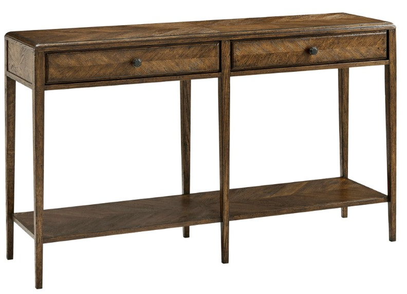 Accentuated with tapered legs and bold Verde Bronze finished handles, NOVA’s rustic two tiered mirrored herringbone console table includes a rectangular oak parquetry top and two frieze drawers in the Dusk finish.Read More