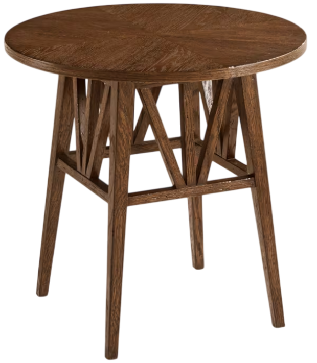 Solid wood, veneer, brass our dusk finished Nova round side displays the originality of nova’s design with its geometrically arranged oak pattern on a round top. Crafted with a flat truss oak stretcher and a tapered oak leg.Read More
