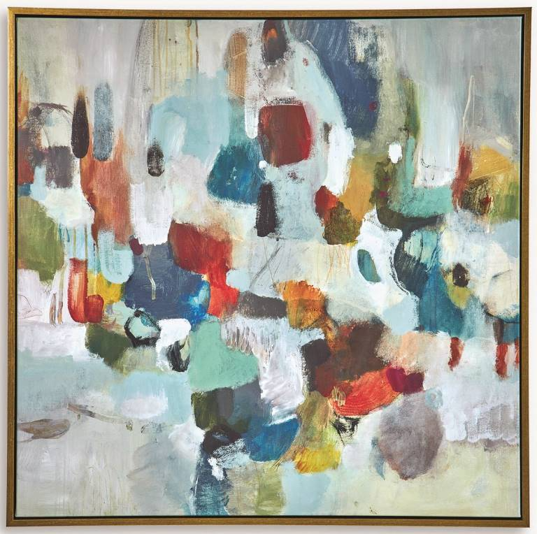 Giclee on canvas, this abstract piece features shades of gray, blue, and burgundy highlighted with pops of olive and mustard. A solid wood gallery frame with gold finish completes the artwork. May be hung horizontal or vertical. Each canvas is proudly handcrafted and printed in USA. Artwork by Lisa Ridgers.Read More
