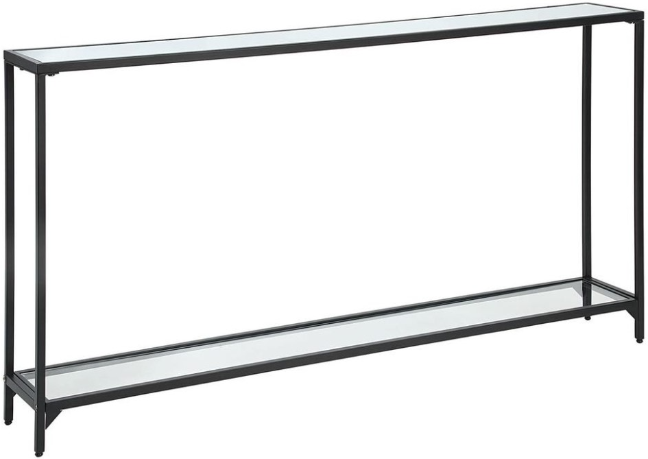 The narrow, simple profile of this iron console table will make it perfect for a foyer or any limited space. The clean lines and modern design are accented in a black finish. The top shelf is mirrored, with tempered glass on the lower shelf. Anti tip hardware included.Read More