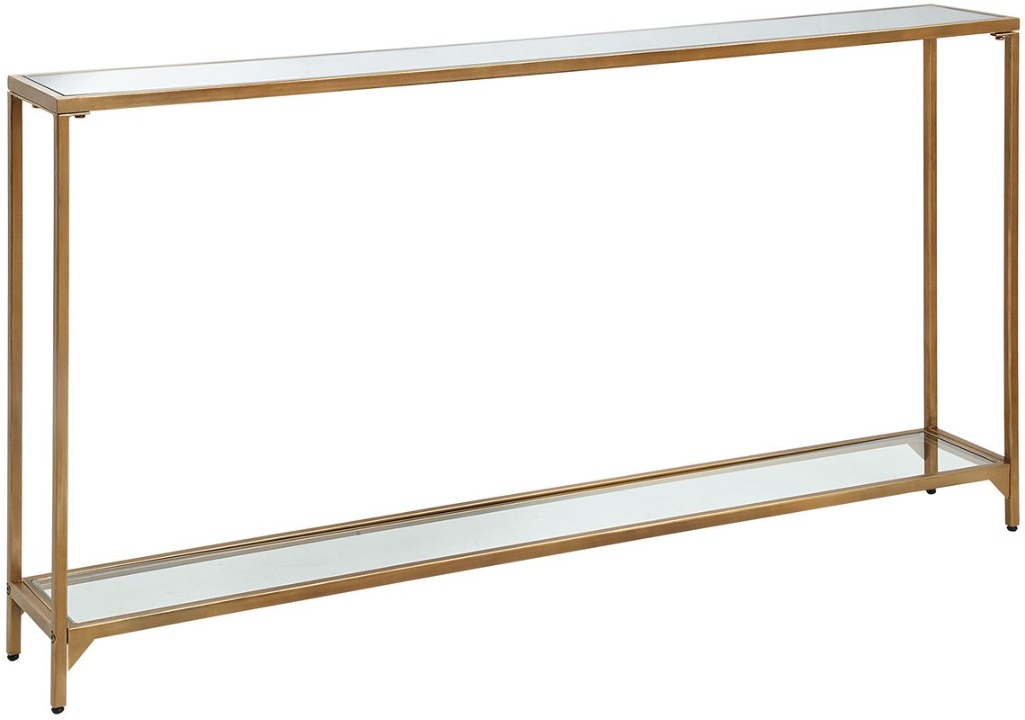 The narrow, simple profile of this iron console table will make it perfect for a foyer or any limited space. The clean lines and modern design are accented in a warm gold finish. The top shelf is mirrored, with tempered glass on the lower shelf. Anti tip hardware included.Read More