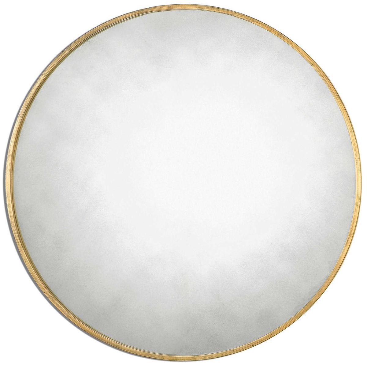 Narrow metal frame with a heavily antiqued gold leaf finish surrounds the antique style mirror.Read More