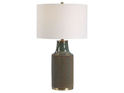 This casual ceramic table lamp is finished in a bluish green with highlights of rust undertones. Brushed brass accents complement the beautiful finish and a round white linen shade completes the look.Read More