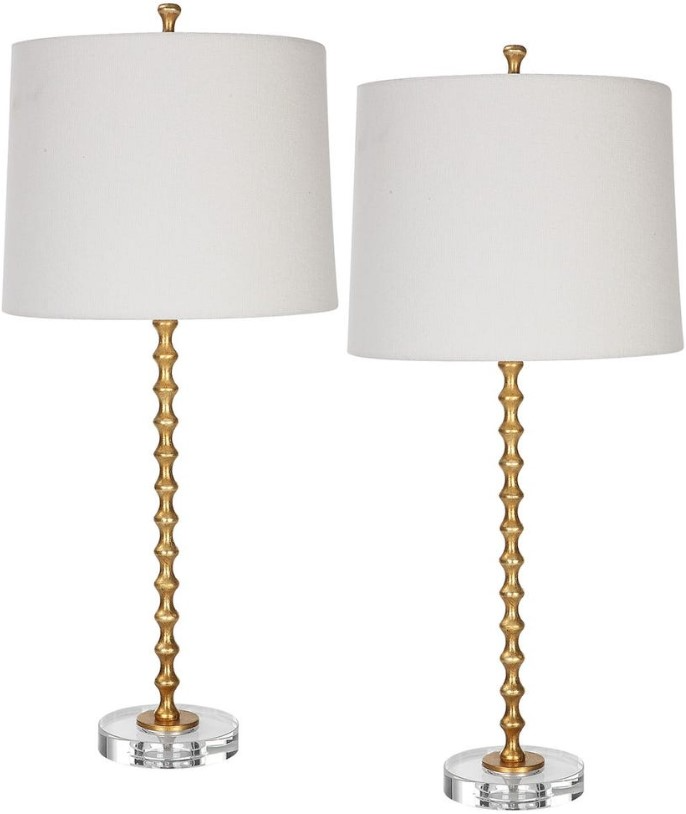 A vibrant gold leaf finish accentuates the stacked miniature hourglasses which form this simple, yet elegant table lamp. The metal body sits atop a beautiful round crystal base. The slightly tapered shade, with its rolled edge, is an ivory linen fabric. This lamp is sold as a set of two.Read More