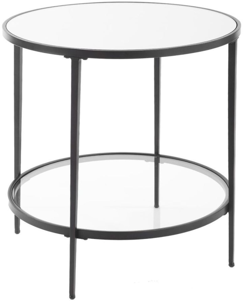 This round end table is crafted from sturdy iron and finished in a satin black for a versatile and contemporary look. The top shelf features a mirrored glass surface, while the bottom shelf is made of tempered glass, offering style and durability.Read More