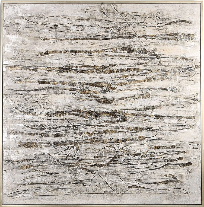 Modern, industrial style emanates from this hand painted abstract on canvas. An array of textured gray, brown, white, and off white brushstrokes are accented by black and metallic silver shades that add dimensional details. A silver gallery frame completes the artwork.Read More