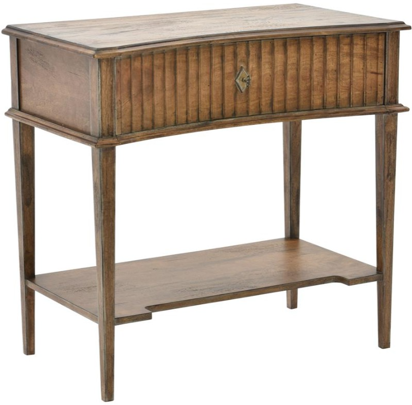 The Taylor side table is crafted of solid mango wood and veneers in a medium brown with antique tones to obtain a beautiful aged finish. This unique side table features one drawer with bronze-finished hardware, one lower shelf, and tapered legs.Read More