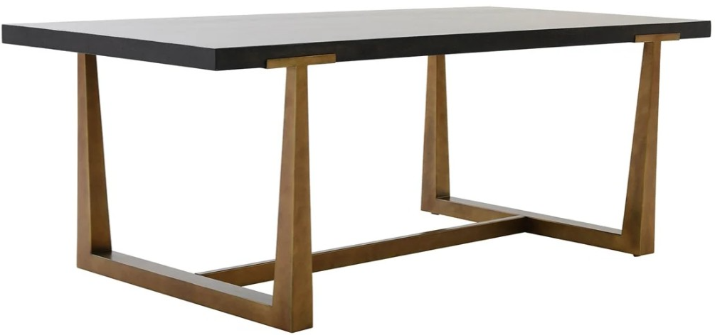 This dining table features a solid wood slab top in a dark Tuscany brown finish, and a sleek metal base with U-shaped legs in an antique gold finish. Crafted from sturdy wood.Read More