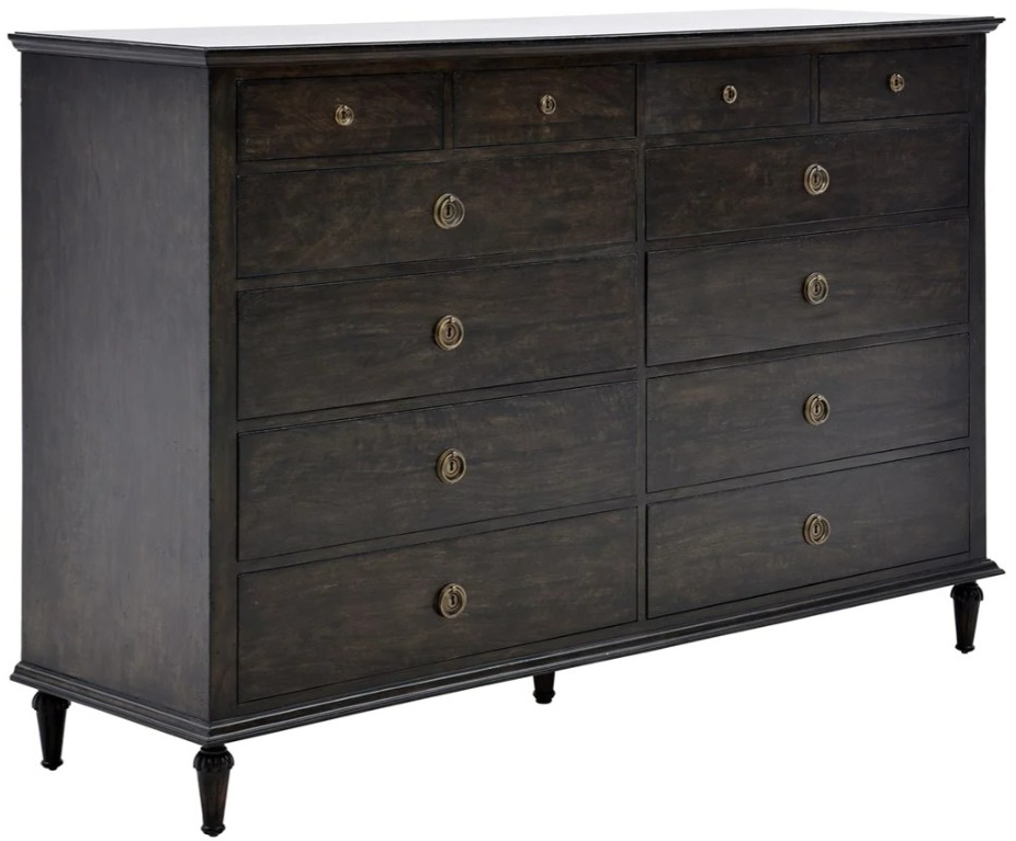 Crafted with select hardwood solids and veneers in a distressed dark mocha finish, this chest features twelve drawers (four small drawers and eight large drawers), decorative bronze finished hardware, and decorative spindle feet.Read More