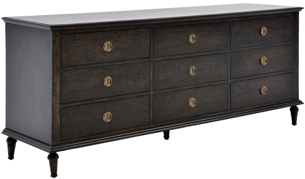 Crafted with select hardwood solids and veneers in a distressed dark mocha finish, this dresser features nine drawers, decorative bronze finished hardware, and decorative spindle feet. It offers ample storage and timeless appeal, making it a versatile addition to bedrooms or living spaces.Read More