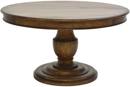 Distressed, rustic pecan finished round dining table features a simply-styled single pedestal base and one 16" leaf. Its durable construction and timeless look make it perfect for family gatherings or everyday dining in a cozy, inviting space.Read More